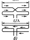Увеличить сопротивление излучения при увеличении длины антенны можно двумя путями. Во-первых, можно согнуть участки с противоположным направлением тока в неизлучающие четвертьволновые шлейфы, как это делается в синфазных антеннах (см. рис. 6.1,ж). Но при этом общая длина входящих в антенную систему проводов, определяющая сопротивление потерь, оказывается почти вдвое больше длины излучающей части. Поэтому синфазные антенны из проводов, вытянутых в одну линию, применяются только для получения направленного излучения. Во-вторых, можно согнуть антенный провод в тех местах, где изменяется направление