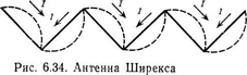 тока. Тогда пространственное направление токов в отдельных участках антенной системы уже не будет противоположным, и при угле изгиба в 90° компенсирующее действие их излучения сведется к нулю. Образующаяся при этом система носит название антенны Ширекса (рис. 6.34).