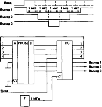 Отметим, что дискрет временных сдвигов между выходными сигналами микропрограммного автомата равен периоду тактовой частоты, а задержка реакции на изменение входного сигнала имеет случайный характер, но не превышает периода тактовой частоты (если не принимать специальных мер по синхронизации тактового генератора и входных сигналов). Эти особенности необходимо иметь в виду при выборе схемы и составлении микропрограммы.