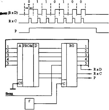 Для формирования сигнала RxC после выявления очередного перехода (фронта) в середине битового интервала автомат не реагирует на входной сигнал в течение трех четвертей длительности одного бита (Т). Для формирования сигнала Р после обработки последнего бита проверяется наличие фронта входного сигнала в течение 1,5 Т, и в случае его отсутствия снимается сигнал Р. В качестве выходного сигнала данных RxD используется пропущенный через регистр входной сигнал. Тактовая частота микропрограммного автомата в восемь раз превышает частоту поступления входных данных. Прошивка ППЗУ приведена в табл. 2.4.