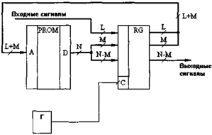 Наиболее универсальная схема микропрограммного автомата строится на основе ППЗУ или ПЛМ и регистра, охваченных обратной связью. В этом случае алгоритм работы автомата определяется исключительно прошивкой ППЗУ или ПЛМ и может быть при необходимости очень просто изменен заменой микросхемы. Обобщенная структура автомата на ППЗУ представлена на рис. 2.35. Она включает в себя ППЗУ с (L + М > адресными входами и N разрядами данных, (N + L)-разрядный регистр и тактовый генератор Г. Часть выходных разрядов ППЗУ, (N — М), используется для формирования выходных сигналов, а остальные М разрядов участвуют совместно с L входными сигналами в формировании адреса ППЗУ в следующем такте тактового генератора. Отметим, что в данной схеме необходимо применять только микросхемы регистров со стробированием по фронту (а не по уровню, не регистры-защелки), так как в противном случае при переходе регистра в режим пропускания входной информации замкнется обратная связь и возможна даже неконтролируемая автогенерация. Примеры микросхем регистров: КР1533ИР23, КР1533ИР27, КР1533ИР37 и т.д. Максимальная тактовая частота автомата, определяющая его быстродействие, должна быть такой, чтобы суммарная задержка регистра и ППЗУ не превышала периода тактовой частоты.