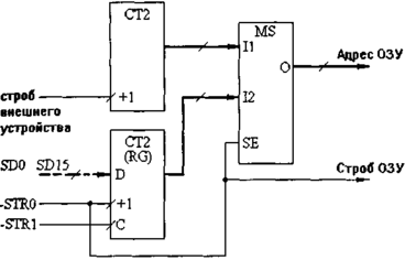 В случае УС с непрерывным режимом обмена с внешним устройством для задания адреса ОЗУ приходится применять две схемы формирования адреса и мультиплексор для выбора одной из них. На рис. 2.32 верхний счетчик формирует адрес, по которому осуществляется обмен с внешним устройством (он работает постоянно). Нижний счетчик (или регистр) задает адрес ячейки ОЗУ, с которой производится обмен со стороны магистрали. При обращении со стороны магистрали по сигналу -STR0 мультиплексор переключается на передачу выходного кода нижнего счетчика. По этому же сигналу переключается режим работы ОЗУ. При этом необходимо принять меры для предотвращения нарушения обмена с внешним устройством в момент обращения со стороны магистрали (например, путем введения разделения этих циклов обмена во времени).
