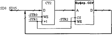 И, наконец, третий путь реализации последовательного доступа к буферному ОЗУ — объединение двух рассмотренных подходов, позволяющее соединить их преимущества (рис 2.31). В данном случае используется счетчик с параллельной записью, в который перед началом обмена записывается по сигналу -STRO начальный адрес ОЗУ. Затем производится обмен с ОЗУ по сигналам -STR1 и -STR2. Здесь можно перебирать ячейки последовательно, но можно и задавать адрес ячейки произвольно.