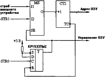 В случае УС с периодическим режимом обмена с внешним устройством схема может быть значительно проще (рис. 2.33). Здесь используется один счетчик, а мультиплексор подключает к его входу или строб внешнего устройства (при обмене с внешним устройством) или строб обмена — STR1 (при обмене с магистралью). После окончания обмена с магистралью по сигналу -STR0 схема переходит в режим обмена с внешним устройством (перебрасывается триггер). Возвращение к режиму обмена с магистралью происходит после полной отработки цикла обмена с внешним устройством и формирования счетчиком сигнала переноса.