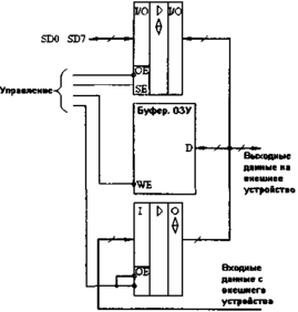 При любой схеме включения буферного ОЗУ возникают две основные проблемы: организация задания адреса ОЗУ во всех режимах работы и организация прохождения потоков данных Рассмотрим несколько примеров решения этих проблем.