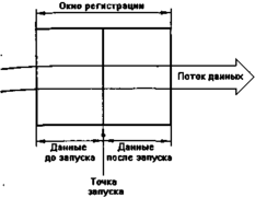В отличие от обычных осциллографов, в которых развертывание формы входного сигнала начинается в момент запуска (то есть прихода внешнего сигнала запуска или превышения входным сигналом заданного уровня напряжения), здесь точка запуска может быть и в начале, и в середине, и в конце окна регистрации. Под запуском здесь понимается временная привязка процесса регистрации к исследуемому процессу. Запуском может служить, например, появление в потоке данных заданного кода или переход (фронт) на одной из входных линий. В этом случае оператор может видеть не только то, что происходило после запуска (как в случае с обычным осциллографом), но и то, что происходило до него.
