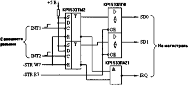 Схема УС может быть дополнена узлом обработки прерываний от внешних устройств. Пусть УС должно принимать два сигнала прерываний и формировать один сигнал требования прерывания IRQ. При этом надо предусмотреть возможность для компьютера определить, какое именно прерывание из двух внешних поступило на УС, для чего удобно использовать незадействованный сигнал -STR R7. Возможное решение такой схемы обработки прерываний — на рис. 2.40. Внешними прерываниями являются положительные фронты сигналов INT1 или INT2, перебрасывающие триггеры, выходы которых формируют IRQ. Для чтения номера пришедшего прерывания использован буфер КР1533ЛП8, открывающийся сигналом -STR R7. Этим же сигналом триггера сбрасываются в исходное состояние.