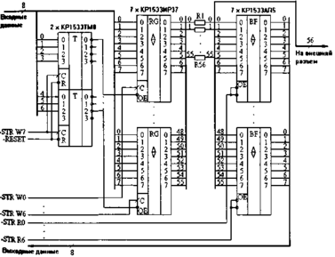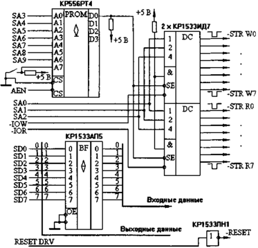 Управляющие сигналы операционной части используются для записи выходных данных (-STR W0 ... -STR W6), для чтения входных данных (-STR R0 ... -STR R6), для записи управляющего слова (-STR W7), определяющего направление передачи каждого из семи 8-разрядных портов, а также для перевода всех внешних линий в состояние приема при включении питания (по сигналу -RESET). Именно эти сигналы должна формировать интерфейсная часть, к которой мы теперь возвращаемся.
