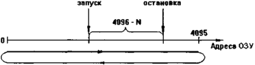 От счетчика требуется максимальное быстродействие (можно взять, например, микросхемы КР531ИЕ17, которые достаточно легко каскадируются без потери быстродействия). Кроме простого перебора адресов счетчик должен также обеспечивать предпусковую регистрацию. Остановимся на этом несколько подробнее. Для того чтобы реализовать предпусковую регистрацию, необходимо до прихода запуска непрерывно переписывать содержимое буферного ОЗУ по кругу (рис. 2.42.). Если мы выбираем глубину предпусковой регистрации N тактов, то надо остановить регистрацию через (4096 — N) тактов после прихода запуска. Затем надо считывать содержимое ОЗУ, начиная с точки остановки с перебором адресов в том же направлении, что и при регистрации. Проведя 4096 операций чтения содержимого ОЗУ, мы получим N тактов до запуска и (4096 — N) тактов после запуска, то есть моменту прихода запуска будет соответствовать адрес ОЗУ, считанный N-ым.
