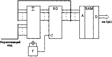 Еще один пример УС с буферным ОЗУ — это цифровой программно-управляемый генератор сигналов произвольной формы, позволяющий формировать аналоговые сигналы с заданными параметрами: формой, периодом, амплитудой. Такой генератор может использоваться в контрольно-измерительной системе на базе персонального компьютера или в составе промышленных установок, в которых требуется формирование различных сигналов (разовых или периодических), например в системах виброиспытаний.