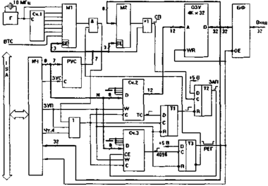 Сигнал РЕГ с выхода ТЗ служит флагом готовности и используется для выработки прерывания. По окончании регистрации по четырем адресам компьютер считывает записанную в ОЗУ 32-разрядную информацию. При этом сигнал чтения из четвертого адреса Чт.4 (STR R3) перебрасывает на единицу Сч.2, то есть изменяет адрес ОЗУ. Этот процесс чтения повторяется 4096 раз. В результате полный цикл перекачки зарегистрированной информации включает в себя 16384 обращения к логическому анализатору.