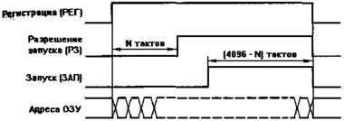 В результате счетчики анализатора должны обеспечивать временную диаграмму, показанную на рис. 2.43. Адреса ОЗУ начинают перебираться с началом регистрации. В течение N тактов после начала регистрации запуск запрещен. Через (4096 — N) тактов после прихода запуска регистрация прекращается.