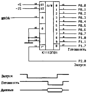 С помощью УКПО просто реализуется асинхронный протокол взаимодействия с "медленными" внешними устройствами. Основа такого протокола — цикл типа "команда—ожидание реакции—действие". В качестве примера рассмотрим сопряжение БИС АЦП 1113ПВ1 с компьютером с помощью УКПО. Условное обозначение БИС, ее подключение к портам УКПО и временные диаграммы работы показаны на рис. 2.58. Видно, что процедура чтения кода с АЦП реализуется последовательностью действий: запуск — ожидание готовности — чтение данных.