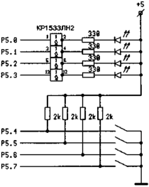 Понятно, что если для "поджигания" лампочек просто вывести соответствующую тетраду в порт 5, это может привести к конфликту на четырех старших линиях между выводимой информацией и состоянием ключей. Поэтому в старшую тетраду надо записывать те данные, которые установлены ключами. Для этого приходится считывать их состояние при каждой записи в порт 5. Для считывания состояния ключей необходимо переводить порт 5 на ввод, а затем после чтения — опять на вывод. Такое кратковременное отключение порта от лампочек (время зависит от быстродействия компьютера, но во всяком случае не превосходит нескольких десятков микросекунд) не будет заметно.