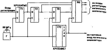 Для целей динамической отладки удобно использовать все тот же персональный компьютер, дополненный модулями динамической генерации входных сигналов отлаживаемого УС и динамической регистрации его выходных сигналов. В качестве такого модуля регистрации можно применить логический анализатор, описанный в разделе 2.1.10. Конечно, быстродействие данного анализатора не всегда достаточно для измерения малых временных задержек, но его можно заметно увеличить за счет снижения количества разрядов (рис. 2.64). Тем более, что такое быстродействие (в нашем случае 80 МГц) по всем входам регистрации, как правило, и не нужно. Достаточно иметь его по одному-двум входам.