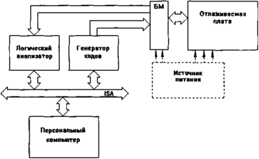 Структура системы динамической отладки в данном случае будет довольно простой (рис. 2.65). Дополнительный буферный модуль (БМ) служит для усиления сигналов с целью передачи их по соединительному кабелю и формирования пришедших по кабелю сигналов. Генератор кодов задает последовательности сигналов интерфейса ISA, а логический анализатор контролирует как канальные сигналы ISA, так и сигналы с внутренних точек отлаживаемого УС. При этом контроль за правильностью функционирования может быть возложен как на оператора, анализирующего фиксируемые временные диаграммы на экране компьютера, так и на компьютер, сравнивающий полученные временные диаграммы с эталонными, хранящимися у него в памяти. Последний режим особенно удобен в том случае, когда нам нужно не чинить плату УС, а только проконтролировать ее исправность по принципу "годен — не годен", что очень полезно при выходном контроле на производстве. При этом мы можем практически полностью автоматизировать процесс контроля, возложив на оператора только смену контролируемых плат.