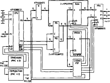 Мы не будем подробно останавливаться на структуре и особенностях работы КРШОВЕ31 и других однокристальных микроЭВМ. Информация об этом имеется в многочисленных справочниках. Отметим только, что, изменяя программное обеспечение, зашитое в ППЗУ, можно обеспечить выполнение самых различных алгоритмов управления широким спектром внешних устройств. Что касается аппаратуры, то здесь обычно используется стандартная схема включения, и разработчик УС должен только аккуратно ее повторить. Поэтому говорить об особенностях проектирования отдельных узлов УС данного типа не приходится.