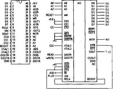Одной из них является ныне безнадежно устаревшая микросхема программируемого универсального синхронно-асинхронного приемопередатчика 18251 (КР580ВВ51). Она содержит шинный интерфейс и собственно преобразователь кода. Микросхема требует двух внешних задающих генераторов частоты (один из которых задает скорость передачи, а другой формирует внутренние тактирующие импульсы), что является ее очевидным недостатком. Эта микросхема подробно описана во множестве книг, посвященных построению микропроцессорных структур, но сейчас уже практически нигде не используется.