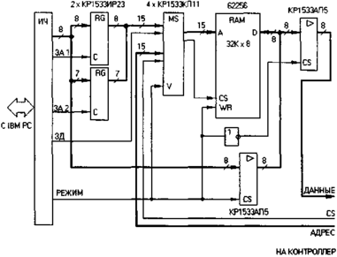 Структура эмулятора (рис. 2.14) помимо собственно микросхемы ОЗУ объемом 32 К х 8 содержит интерфейсную часть (ИЧ), 15-разрядный регистр адреса, 16-разрядный двухканальный мультиплексор адреса и сигнала выбора ОЗУ и два 8-разрядных буфера данных. Схема работает в одном из двух возможных режимов (сигнал РЕЖИМ): записи информации из компьютера в ОЗУ и эмуляция ППЗУ.