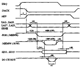 Помимо циклов программного обмена на магистрали ISA могут выполняться также циклы прямого доступа к памяти (ПДП). Временная диаграмма для этого случая показана на рис 1.5. Так как магистраль ISA имеет раздельные стробы чтения и записи для устройств ввода/вывода и для памяти, пересылка данных в режиме ПДП производится за один машинный цикл. То есть если данные надо переслать из устройства ввода/вывода в память, то одновременно производится чтение данных из устройства ввода/вывода (по сигналу -IOR) и их запись в память (по сигналу -MEMW). Аналогично производится пересылка данных из памяти в устройство ввода/вывода (по сигналам -MEMR и -IOW).
