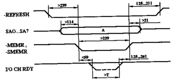 Одной из особенностей магистрали ISA является необходимость проведения регенерации динамической памяти компьютера с помощью специальных циклов регенерации на магистрали. Временная диаграмма цикла регенерации показана на рис. 1.6. Эти циклы выполняет входящий в состав материнской платы компьютера контроллер регенерации, который должен для этого получать управление магистралью каждые 15 микросекунд. Во время цикла регенерации производится чтение одной из 256 ячеек памяти (для адресации используются только восемь младших разрядов адреса SA0...SA7). При этом читаемая информация нигде не используется, то есть это цикл псевдочтения. Проведение 256 циклов регенерации, то есть псевдочтение из 256 последовательных адресов ОЗУ, обеспечивает полное освежение информации в ОЗУ и ее непрерывное сохранение. Если по каким-то причинам цикл регенерации не производит ся вовремя, то возможна утеря информации в ОЗУ. Цикл регенерации включает в себя выставление сигналов -REFRESH, адреса SA0...SA7 и -MEMR. В случае необходимости может использоваться сигнал I/O CH RDY.