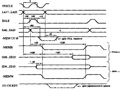На рис. 1.4 приведены временные диаграммы циклов обмена с памятью (указаны только временные интервалы, отличающиеся от аналогичных на рис. 1.3). Для асинхронного режима обмена (удлиненного цикла) здесь также используется сигнал I/O CH RDY. Отметим, что УС, работающее как память, должно обрабатывать все адресные разряды, включая LA17...LA23.