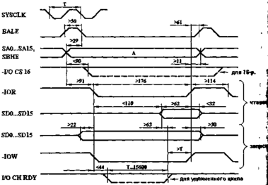В случае, когда УС не успевает выполнить требуемую от него команду в темпе магистрали, оно может приостановить на целое число периодов сигнала SYSCLK завершение цикла чтения или записи с помощью снятия (перевода в низкий уровень) сигнала I/O CH RDY (так называемый удлиненный цикл). Это производится в ответ на получение сигнала -IOR или -IOW. Сигнал I/O CH RDY может удерживаться низким не более 15,6 мкс, в противном случае процессор переходит в режим обработки немаскируемого прерывания. Отметим, что некоторые изготовители персональных компьютеров указывают в сопроводительной документации другие допустимые величины этого временного интервала (например, 2,5 мкс), так что не следует ориентироваться на максимальную величину, указанную в стандарте, иначе нет гарантии работы УС во всех компьютерах.