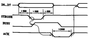 Рис 1.7. Временные диаграммы цикла передачи данных в Centronics (все временные интервалы в наносекундах).