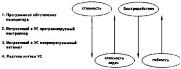 При разработке УС необходимо в первую очередь сформулировать требования, предъявляемые к нему, проанализировать функции, которые компьютер должен выполнять с помощью данного УС. В общем случае эти функции могут быть реализованы как аппаратурой УС, так и программным обеспечением компьютера. В свою очередь, УС может включать в себя процессор, однокристальный контроллер, микропрограммный автомат или жесткую логику. Сочетания перечисленных решений различаются между собой стоимостью, сложностью решаемых задач, гибкостью (способностью перенастройки на другую задачу), быстродействием (рис. 2.1).