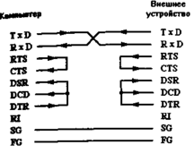 Для двухпроводной линии связи в случае только передачи из компьютера во внешнее устройство используются сигналы SG и TxD. Все 10 сигналов интерфейса задействуются только при соединении компьютера с модемом.