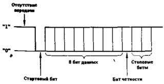 Формат передаваемых данных показан на рис. 1.9. Собственно данные (5, 6, 7 или 8 бит) сопровождаются стартовым битом, битом четности и одним или двумя стоповыми битами. Получив стартовый бит, приемник выбирает из линии биты данных через определенные интервалы времени. Очень важно, чтобы тактовые частоты приемника и передатчика были одинаковыми (допустимое расхождение — не более 10%). Скорость передачи по RS-232C может выбираться из ряда: 110, 150, 300, 600, 1200, 2400, 4800, 9600, 19200, 38400, 57600, 115200 бит/с.