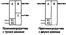На рис. 2.5 показаны три схемы реализации приемопередатчиков для шины данных: на приемнике и передатчике, на приемопередатчике с двумя шинами и на приемопередатчике с тремя шинами (для 8-разрядных данных).
