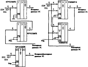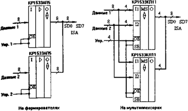 Передатчики часто выполняют функцию мультиплексирования данных, которые должны поступать на шину данных ISA от различных источников. На рис. 2.3. упрощенно показано два наиболее распространенных подхода к решению данной задачи (для 8-разрядной шины данных). Отметим, что при использовании микросхем мультиплексоров надо брать те из них, которые имеют выходы с тремя состояниями и большие выходные токи.