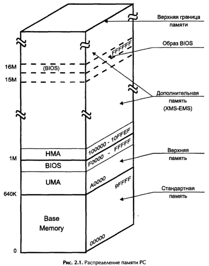 Логическая структура памяти PC обусловлена особенностями системы адресации процессоров семейства х86. Процессоры 8086/88, применявшиеся в первых моделях PC, имели доступное адресное пространство 1 Мбайт (20 бит шины адреса). Эти процессоры использовали сегментную модель памяти, унаследованную и старшими моделями в реальном режиме. Согласно этой модели, исполнительный (линейный) адрес вычисляется по формуле Addr=Segxl6+Offset, где Seg и Offset - содержимое сегментного и адресного регистров. Таким образом, обеспечивался доступ к адресному пространству Addr=00000-FFFFFh при помощи 16-битных регистров. Заметим, что при Seg=FFFFh и Offset=FFFFh данная формула дает адрес 10FFEFh, но ввиду 20-битного ограничения на шину адреса эта комбинация в физической памяти указывает на 00FFEFh. Таким образом, адресное пространство как бы сворачивается в кольцо с небольшим «нахлестом». Начиная с процессора 80286 шина адреса была расширена до 24 бит, а впоследствии (386DX, 486 и старше) до 32 и даже 36 (Pentium Pro и Pentium II) В реальном режиме процессора, используемом в DOS, применяется та же сегментная модель памяти и формально доступен лишь 1 Мбайт памяти, что является недостаточным для большинства современных приложений.