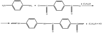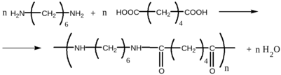 у первых двух, называемых сомономерами, группы «a» и «b» между собой не взаимодействуют, а взаимодействуют только с функциональной группой «с» интермономера. Примером такой реакции может служить поликонденсация двух диаминов и дикарбоновой кислоты: