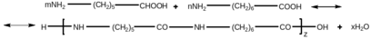 К сополиконденсации относят процессы с участием двух или большего числа мономеров, каждый из которых способен образовать собственный полимер. Например, по реакции сополиконденсации осуществляется синтез смешанного полиамида аминокопроновой и аминоэнантовой кислот:
