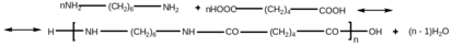- реакция проводится в расплаве и получается полимер Nylon-66 (первая цифра - количество метиленовых групп в диамине, вторая – количество атомов углерода в дикарбоновой кислоте).