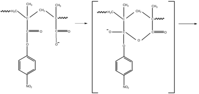 Примером реакции, протекающей с проявлением ускоряющего «эффекта соседа», может быть гидролиз поли-п-нитрофенил метакрилата, скорость которого в 104 раз больше скорости гидролиза низкомолекулярного п-нитрофенилового эфира изомасляной кислоты. Это обусловлено изменением механизма реакции: в полимере гидролиз эфирных групп протекает не под действием «внешних» ионов ОН-, а под влиянием соседних ионизованных карбоксильных групп: