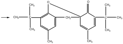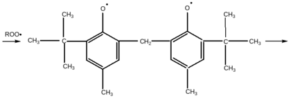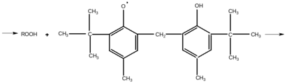 Образующийся радикал Х∙ малоактивен и превращается в неактивные продукты. В качестве Х–Н применяют ароматические фенолы, нафтолы, амины, аминофенолы и т. д. В качестве примера эффективного стабилизатора, в котором «запрограммирована» гибель Х∙ радикала, рассмотрим следующую систему: