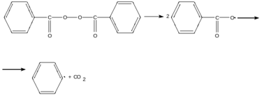 Бензоильный радикал может дальше распадаться с образованием фенильного радикала.