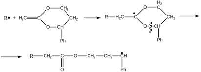 идет разрыв связи, сопряженной с фенильной группой в цикле, образовавшийся радикал атакует далее следующий мономер по концевой CH2- группе.