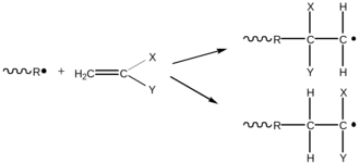 Из-за приведенной выше причины присоединение по типу "голова-хвост-голова-хвост" идет предпочтительней, чем "голова-голова-хвост-хвост". Только в случае, когда имеем маленькие заместители (или сопряжение мало) возможно образование структур "голова-голова-хвост-хвост". Подобное присоединение обнаруживается в случае мономеров с мало сопряженными и не создающими стерических затруднений заместителями (например, винилацетат).