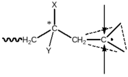 Как исходный мономер, так и концевое звено (конец растущего радикала) имеют плоскую конформацию, т.е. не имеют определенной пространственной конфигурации. При присоединении следующей молекулы мономера, т.е. при удлинении цепочки в этом звене создается псевдоасимметрический атом углерода.