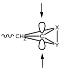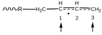 Эта структура является аллильным радикалом, в котором электронная плотность неспаренного электрона распределена примерно поровну между 1 и 3 атомами углерода. В зависимости от направления атаки (1 или 3 атом углерода) и строения переходного комплекса осуществляется 1,2-присоединение и 1,4-присоединение, образование цис- и транс-структур, изо-, синдио- или атактических полимеров.