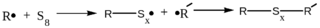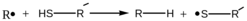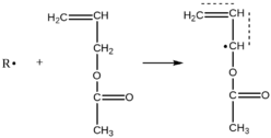 - происходит образование стабильного аллильного радикала. Образующийся радикал (1) далее вступает в реакцию (самопередача цепи). Если же, как, например, в случае аллилацетата (2), радикал малоактивен и практически не вступает в реакцию с новой молекулой мономера. Это называется деградационной передачей цепи.Передача цепи идет и в реакции с меркаптанами: