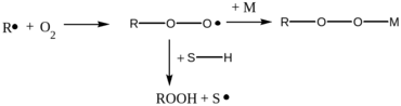 В последнем случае реакция может пойти в двух направлениях: может идти реакция с отрывом водорода и может идти реакция присоединения мономера к R-O-O• радикалу, если мономер достаточно активен. В этом случае получаются полимерные перекиси, образуется нестабильный полимер (по этой причине реакции радикальной полимеризации желательно проводить без доступа воздуха – работать либо в среде инертного газа, либо под вакуумом). В некоторых процессах кислород используется в строго дозирующихся количествах, например, в производстве полиэтилена для инициирования процесса и регулирования ММ образующегося полимера.