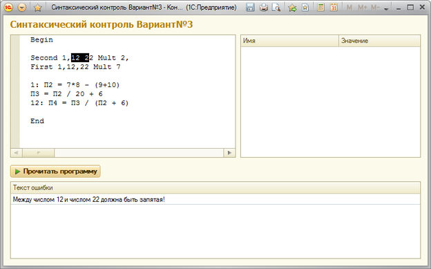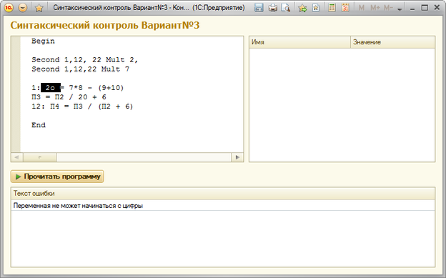 Выход | ПозицияДвоиточия = Найти(ТекстПроверки, ":"); ПозицияЗнакаРавенства = Найти(ТекстПроверки, "="); Если ПозицияДвоиточия <> 0 И ПозицияЗнакаРавенства > ПозицияДвоиточия Тогда ПроверкаМетки = Лев(ТекстПроверки, ПозицияДвоиточия - 1); Попытка ПроверкаМетки = Число(ПроверкаМетки); Если Число(ПроверкаМетки) <> Цел(ПроверкаМетки) Тогда Отказать = Истина; КонецЕсли; Исключение Отказать = Истина; КонецПопытки; Если Отказать Тогда ДобавитьСтрокуОшибки("Метка может быть только целочисленной", 1, ПозицияЗнакаРавенства - 1, Отказать); Возврат Ложь; КонецЕсли; СтруктураПеременных = Новый Структура; Для Каждого СтрокаПеременных Из ТаблицаПеременных Цикл СтруктураПеременных.Вставить(СтрокаПеременных.Имя, Число(СтрокаПеременных.Значение)); КонецЦикла; |