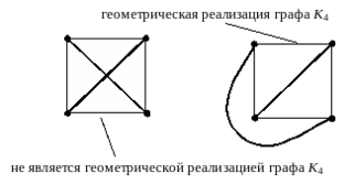G = (V, E). Пусть любой вершине vi графа G сопоставлена некоторая точка ai: vi ai, ai aj (i j), а любому ребру e = (a, b) сопоставлена некоторая непрерывная кривая L, соединяющая точки ai и aj и не проходящая через другие точки ak (k i, j). Тогда если все кривые, сопоставленные рёбрам, не имеют общих точек, кроме концевых, то говорят, что задана геометрическая реализация графа G.