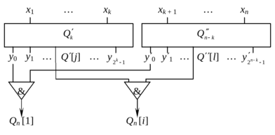 . Разобьём набор входных переменных x = (x1, …, xn) на поднаборы x = (x1, …, xk) и x = (xk + 1, …, xn), где k — некоторый параметр и 1 k n – 1. Пусть Q и Q —функциональные дешифраторы порядка k и n – k от базовых переменных x и x, а и — соответствующие им схемные дешифраторы, построенные по лемме. Легко видеть, что любую конъюнкцию Qn [i], 1 i 2n, можно представить в виде Qn [i] = Q [j]·Q [l], где i = 2n – k(j – 1) + l и 1 j 2k, 1 l 2n – k. Дешифратор порядка n от базовых переменных x содержит дешифраторы и в качестве подсхем и реализует каждую функцию алгебры логики Qn [i], 1 i 2n, с помощью одного функционального элемента &, входы которого присоединены к выходам и в соответствии с формулой Qn [i] = Q [j]·Q [l]. Из построения следует, что L () = 2n + L () + L () 2n + k·2k + 1 + (n – k)2n – k + 1, и поэтому при
