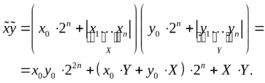 достаточно использовать умножитель Mn со сложностью M (n) для вычисления XY, 2n элементов конъюнкции для вычисления x0Y и y0X, 1 элемент конъюнкции для вычисления x0y0 и 3 сумматора порядка не более 2n + 2, так как